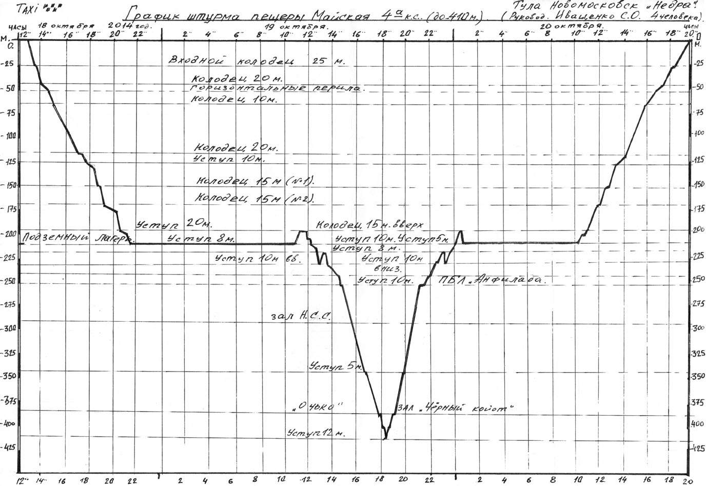 По разным оценкам (альтиметр, сумма потери высот, карта 1978 года) мы дошли да глубины от -350 до -410 метров. Путь обратно был выматывающим и однообразным. Всего рабочий день длился 14 часов. Правда мы не торопились и каждый час отдыхали. В ПБЛ опять заночевали и с утра пошли на поверхность. Выход из пещеры не составил труда. Выходили со всеми вещами и сразу снимали навеску. На поверхности был мороз и лежал снег.
