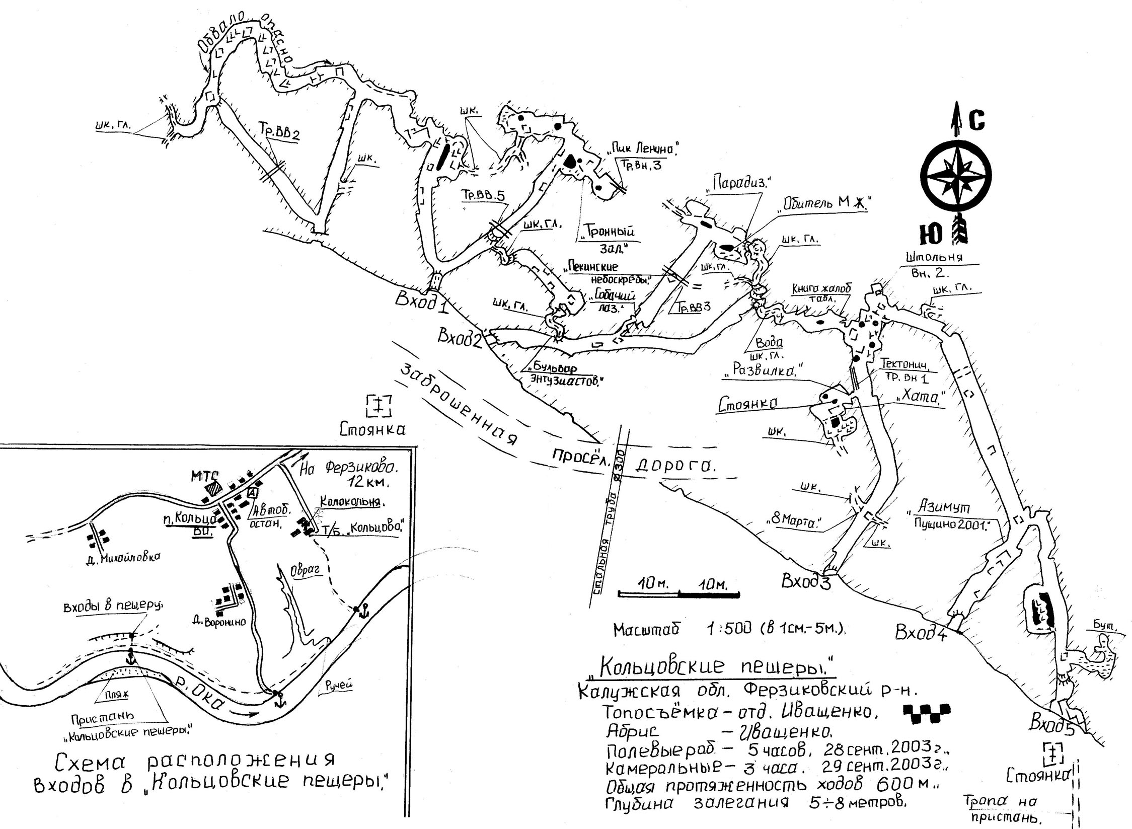 В 15.00 мы все пообедали и группой 10 человек отправились в пещеры.Без происшествий за 1 час дошли до входов.Они расположены в лесу на верху склона и к ним от берега ведёт хорошо заметная каменистая тропа.Все 5 входов находятся в одной горизонтальной плоскости. У крайних входов имеются неплохие стоянки , а на берегу Оки в 100 метрах есть родник.У входа встретили двух ребят из Калужской области. Они сообщили нам , что в настоящее время все ходы связанны под землёй друг с другом. Раньше этого не было.