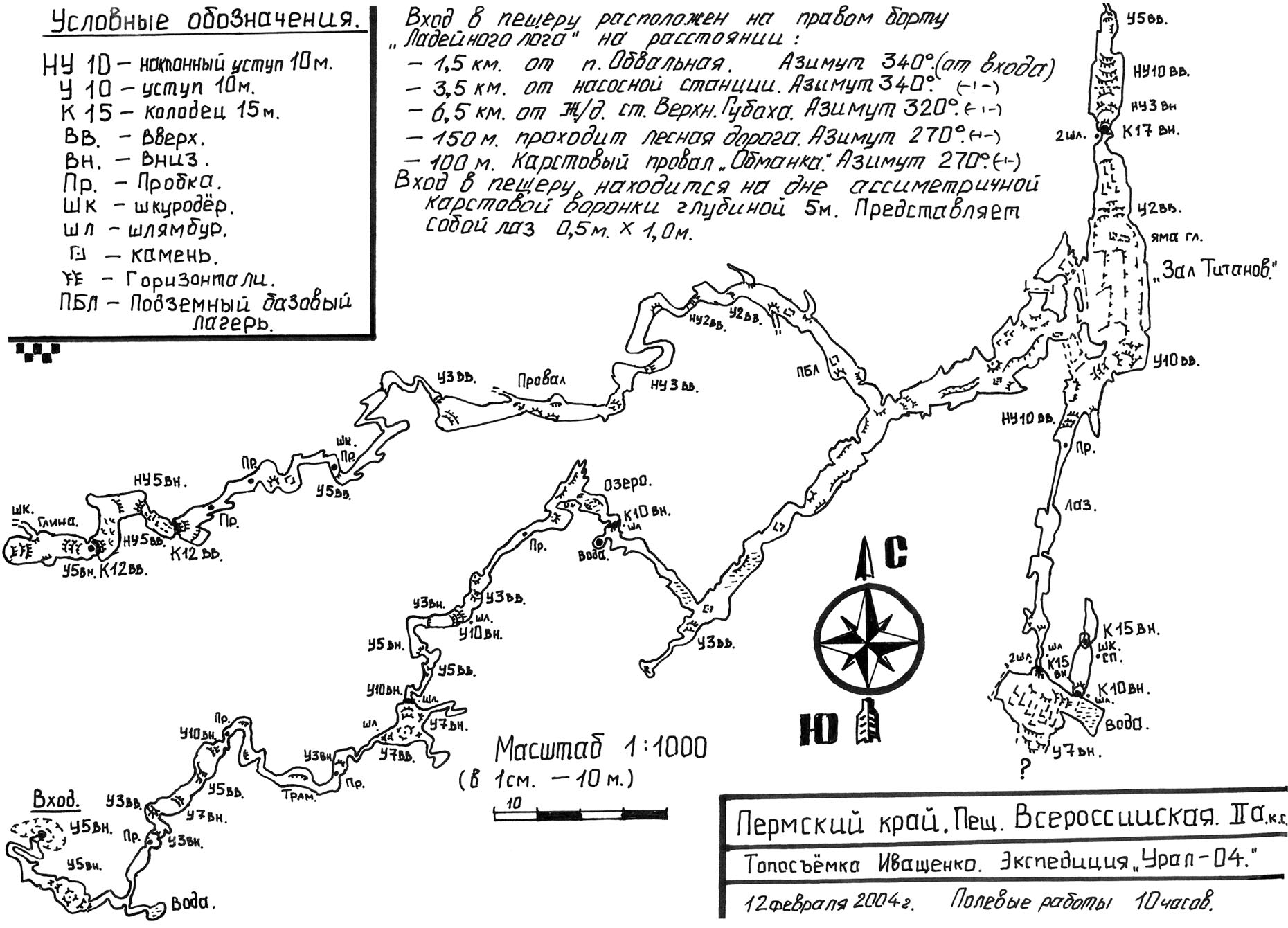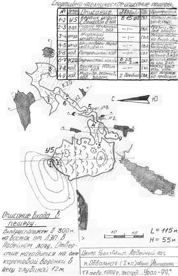 Вход расположен в 300м на восток от ЛЭП в Ладейном логу. Отверстие на дне карстовой воронки глубиной 12м в лесу.