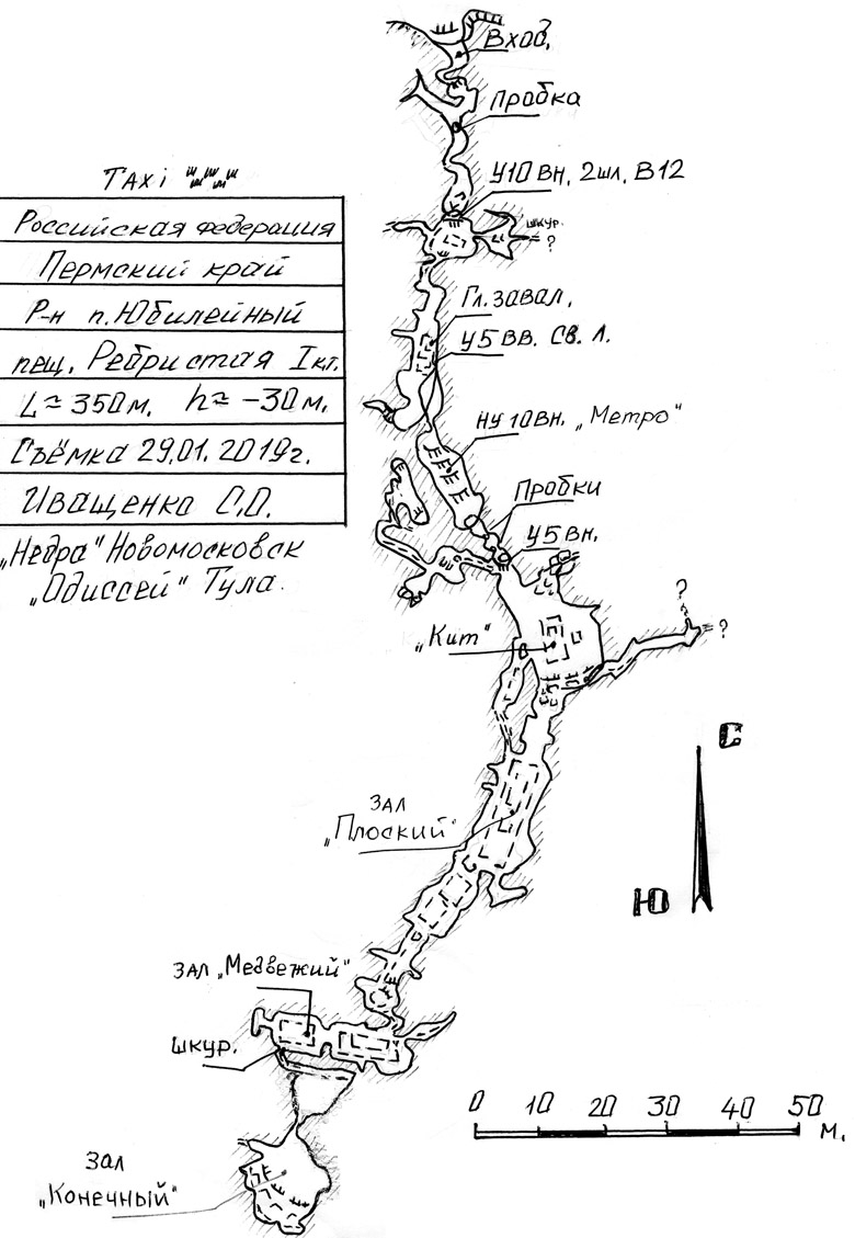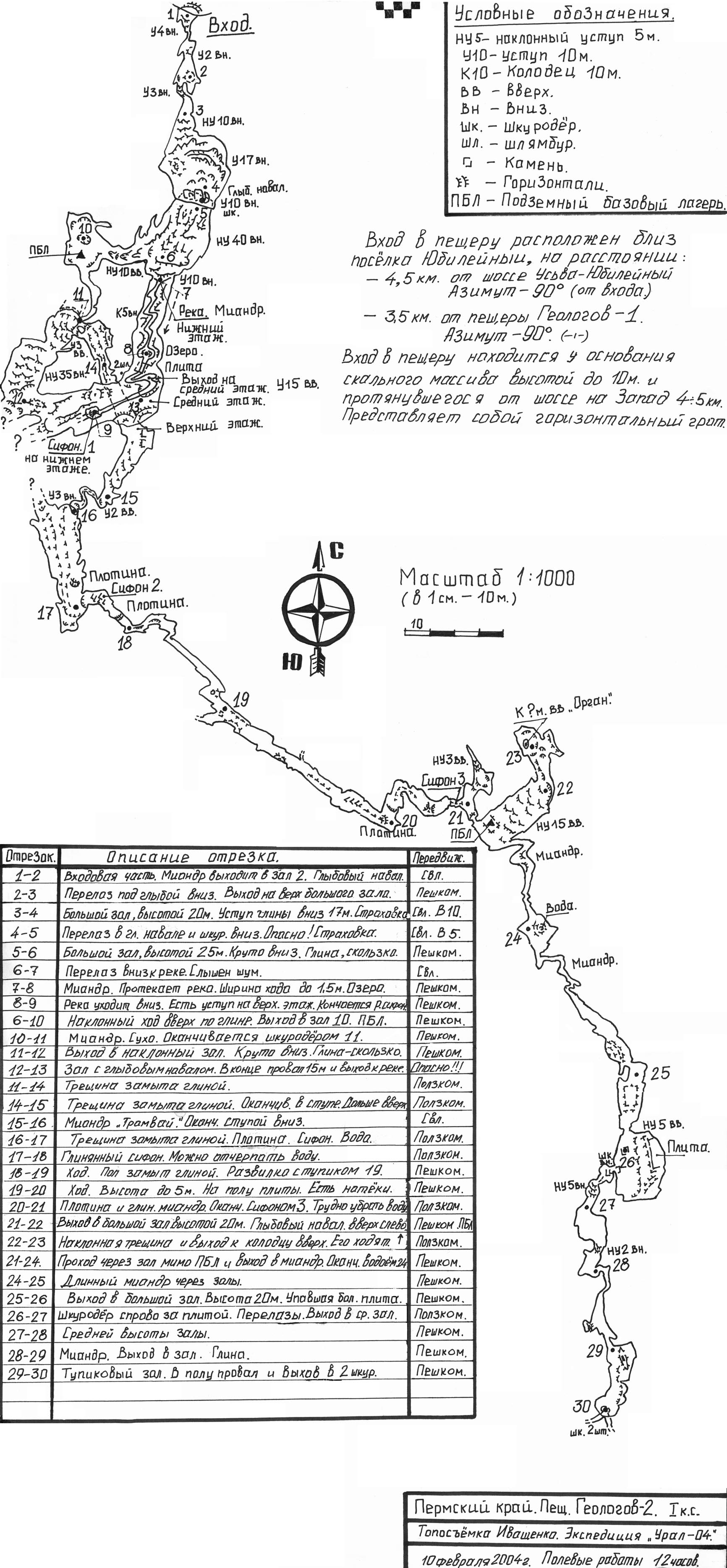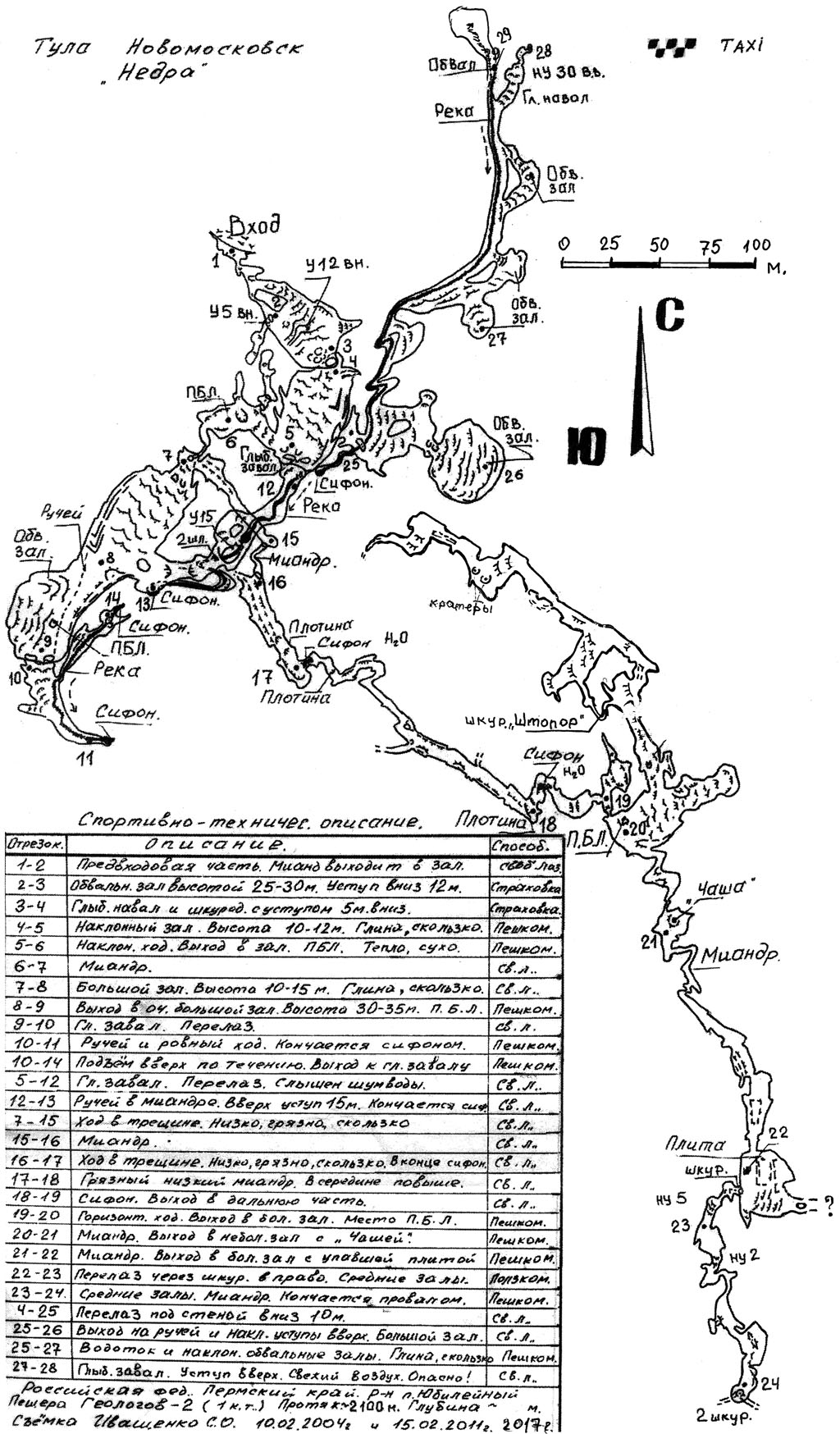 Вход расположен в конце скального массива, в 30-40 минутах ходьбы от дороги. От тропы влево спуск в грот шириной 3м высотой 1-1.5м. Налево уходит шкуродёр, в конце которого остатки тракторной гусеницы, которой когда-то проход был закрыт. Далее направо ход выводит в зал. Из зала в дальней части направо уходит меандр. Меандр выводит в большой зал, в котором по всей видимости велись раскопки. Встречаются кости. Налево вверх глыбовые завалы. В правой части по наклонке уходит "труба" вниз. Чуть дальше развилка. Прямо вниз часть пещеры довольно узкая, ходы заканчиваются непроходимыми шкуродёрами. Направо наклонный ход загибается влево и выводит в зальчик. Много ходов, несколько этажей, зал ПБЛ, глыбовые завалы, шкуродёры, довольно грязно.