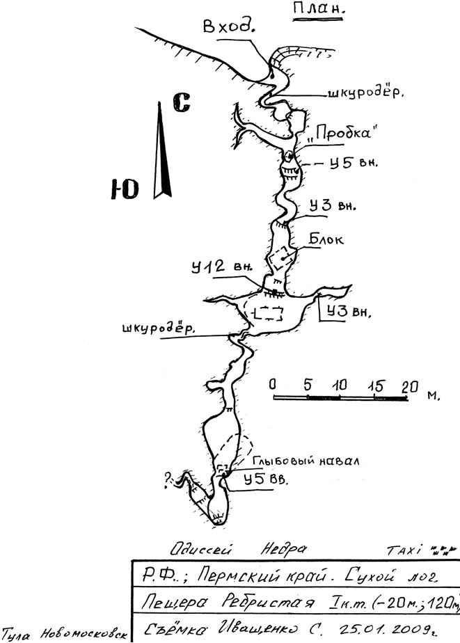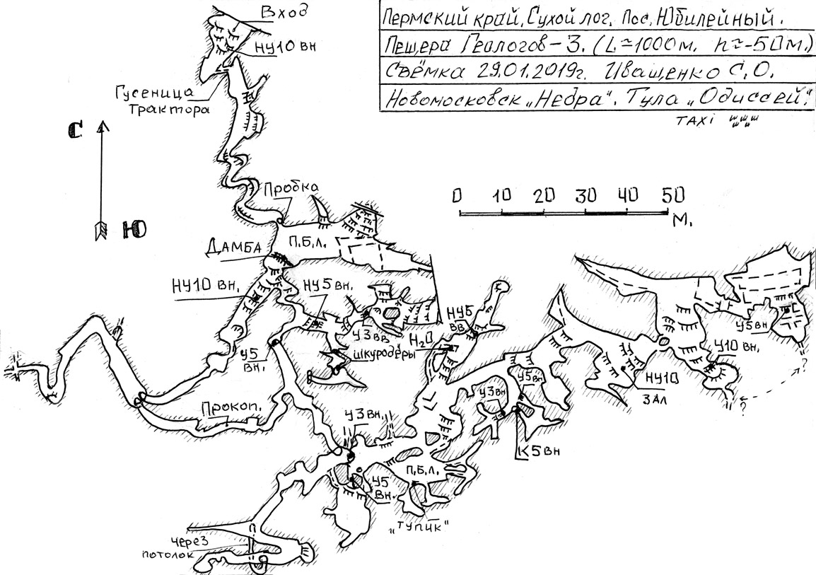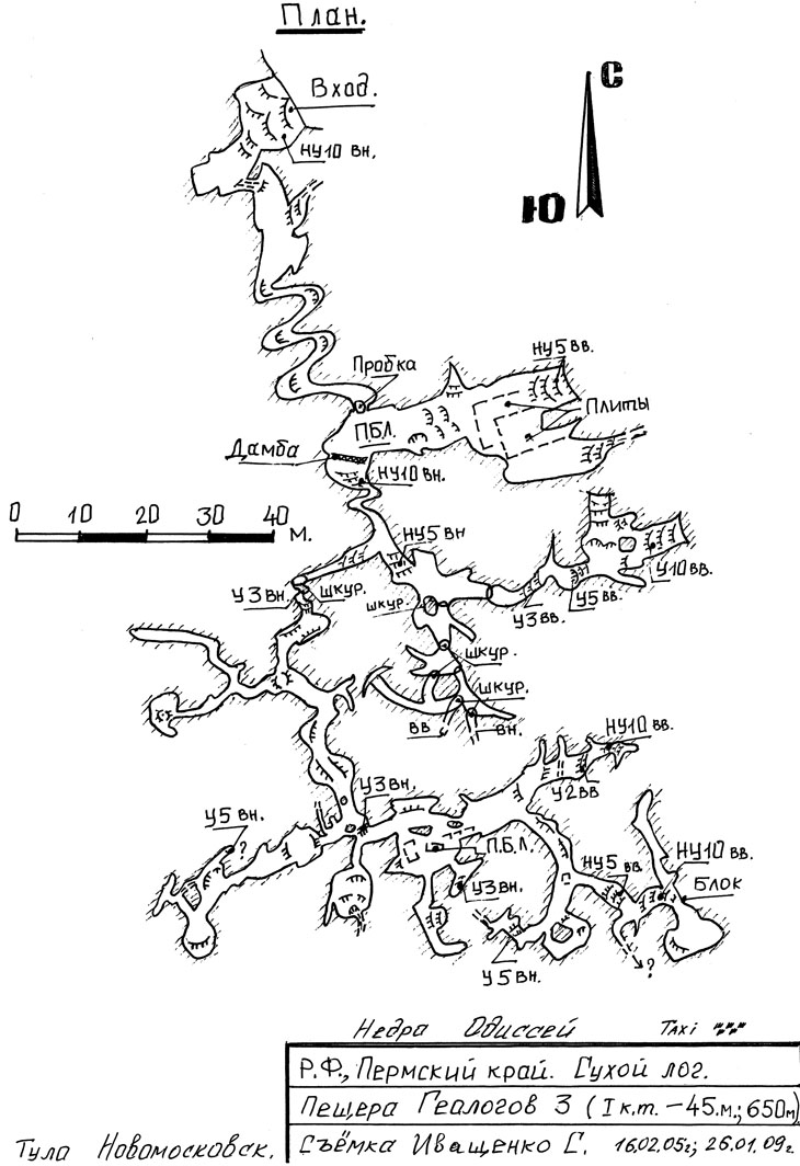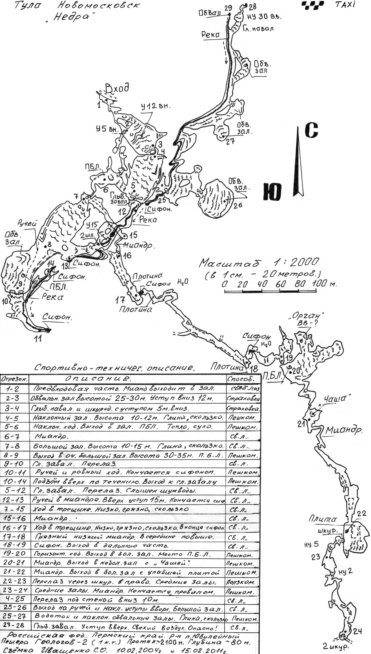 Вход расположен в конце скального массива, в 30-40 минутах ходьбы от дороги. От тропы влево спуск в грот шириной 3м высотой 1-1.5м. Налево уходит шкуродёр, в конце которого остатки тракторной гусеницы, которой когда-то проход был закрыт. Далее направо ход выводит в зал. Из зала в дальней части направо уходит меандр. Меандр выводит в большой зал, в котором по всей видимости велись раскопки. Встречаются кости. Налево вверх глыбовые завалы. В правой части по наклонке уходит "труба" вниз. Чуть дальше развилка. Прямо вниз часть пещеры довольно узкая, ходы заканчиваются непроходимыми шкуродёрами. Направо наклонный ход загибается влево и выводит в зальчик. Много ходов, несколько этажей, зал ПБЛ, глыбовые завалы, шкуродёры, довольно грязно.